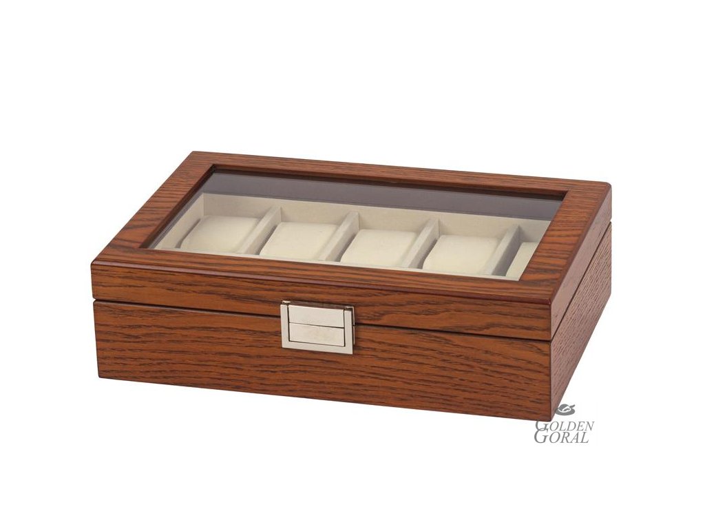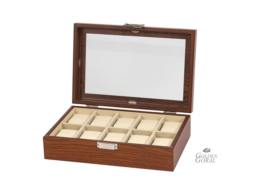 Drevený box na 10 ks hodiniek hnedej farby so skleneným vrchom.