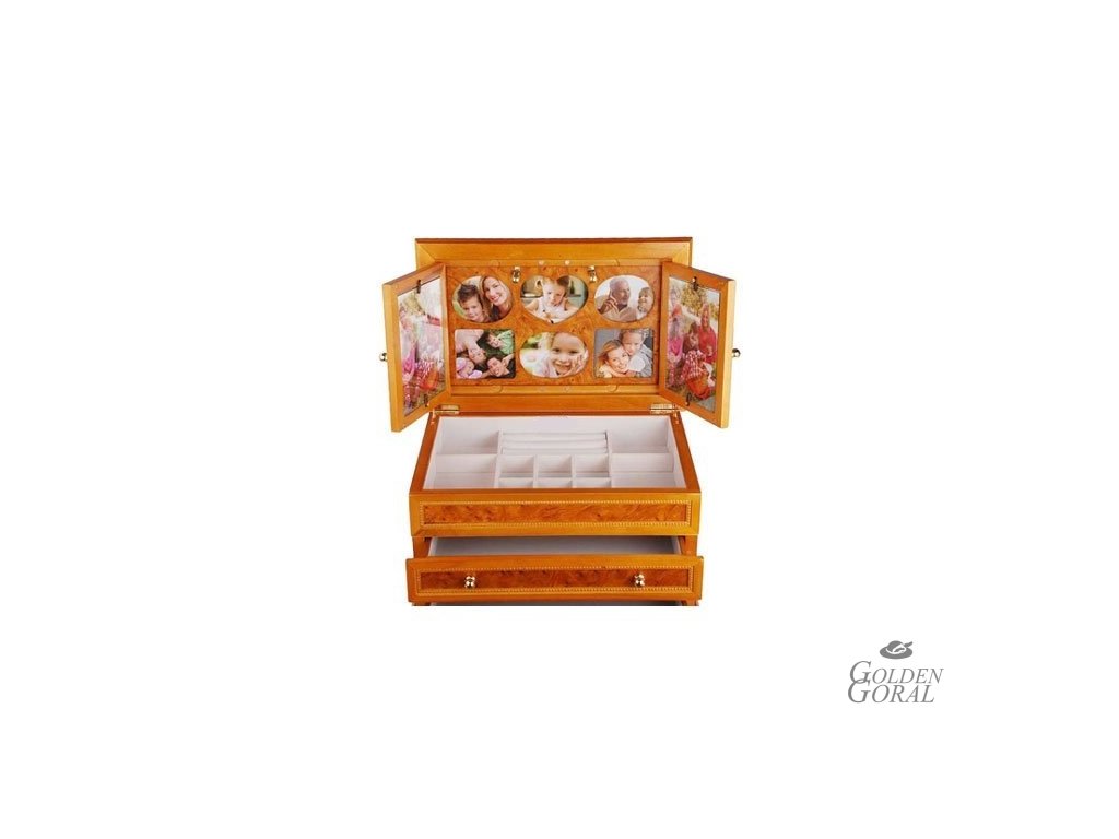 Drevená šperkovnica svetlohnedej farby. Šperkovnica má zrkadlá, ktoré sa dajú otvoriť a za nimi sa nachádzajú rámčeky na fotografie. Šperkovnica má 2 zásuvky a praktické priehradky.