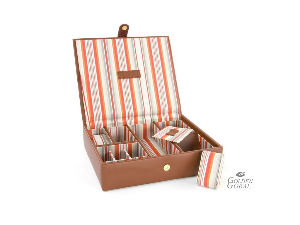 Elegantný pánsky organizér vyrobený z hnedej pravej kože z kolekcie Leathersmith of London v štýlovom pásikavom prevedení. Vhodný na hodinky, šperky, manžetové gombíky a pod.