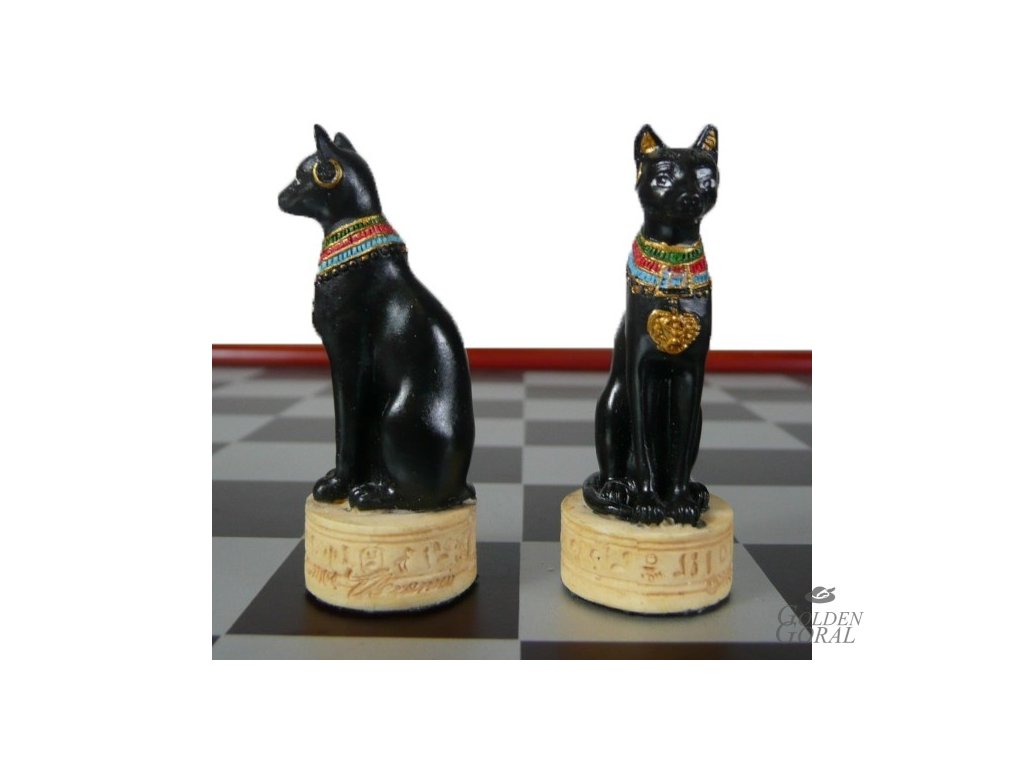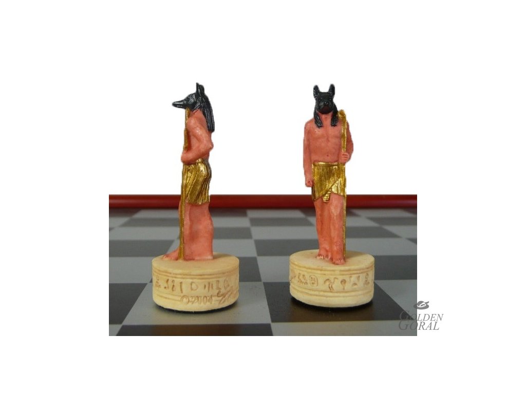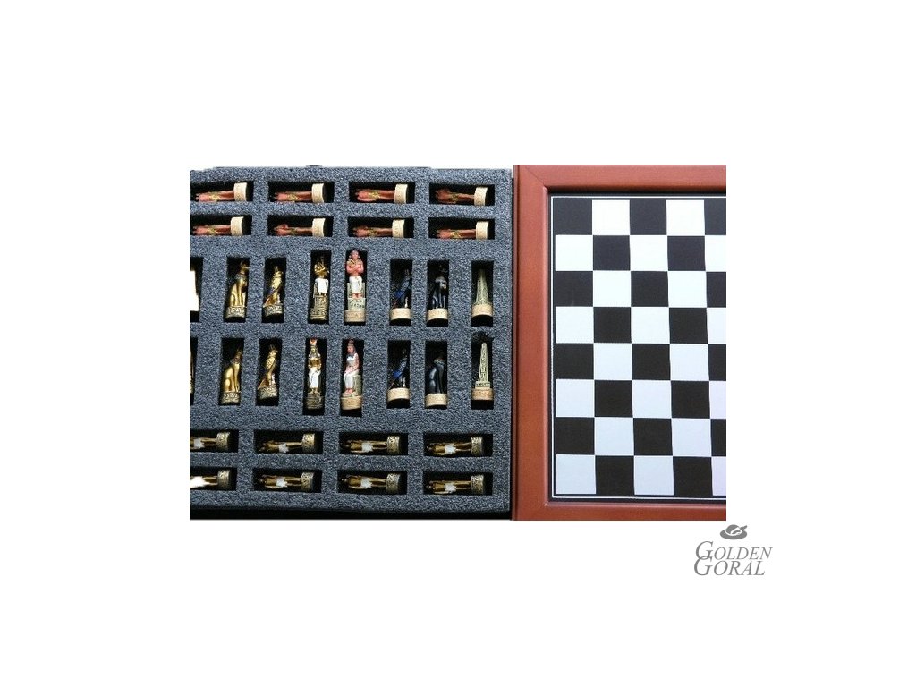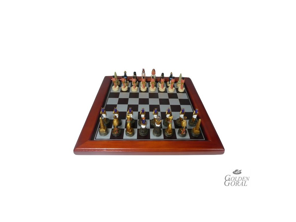 Ručne maľovaný šachový set s egyptským motívom obsahujúci figúrky a šachovnicu.