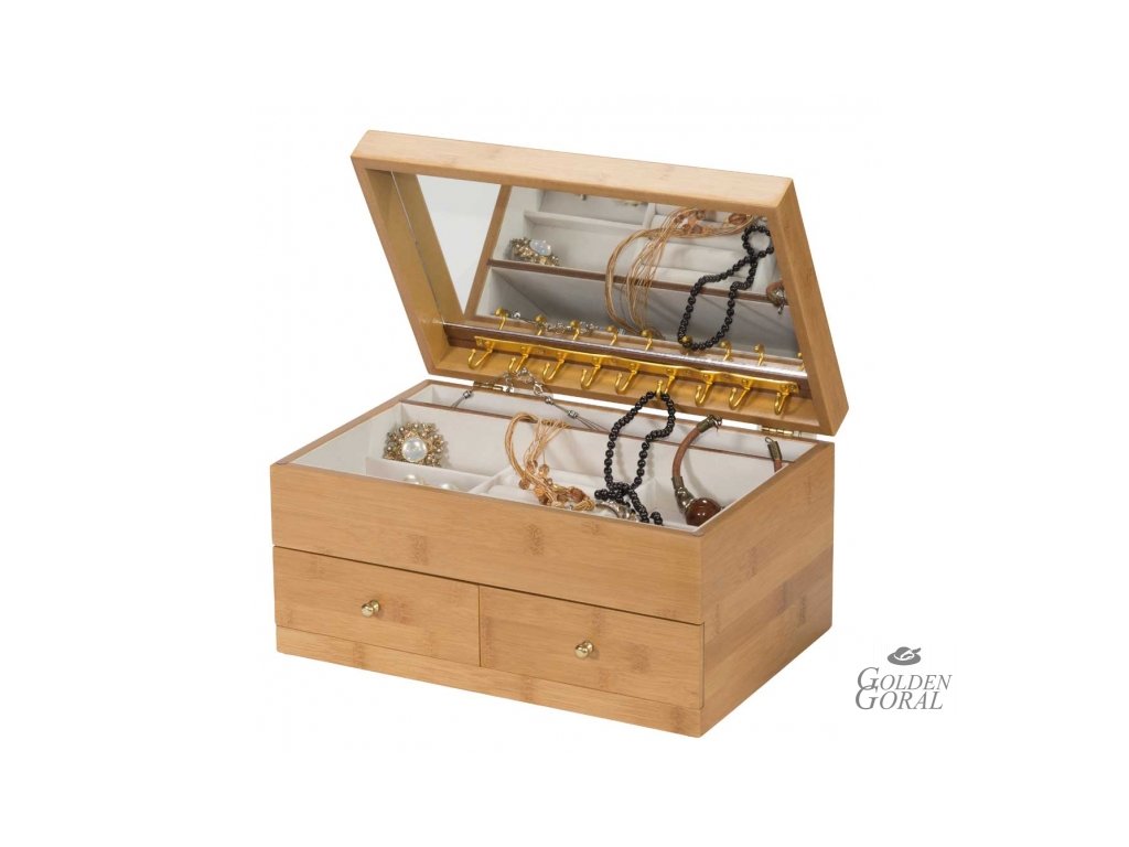 Drevená šperkovnica z kolekcie Bamboo collection má vo vnútri veka veľké zrkadlo a dva malé zásuvky. Šperkovnica je vybavená priehradkami pre lepšiu prehľadnosť.