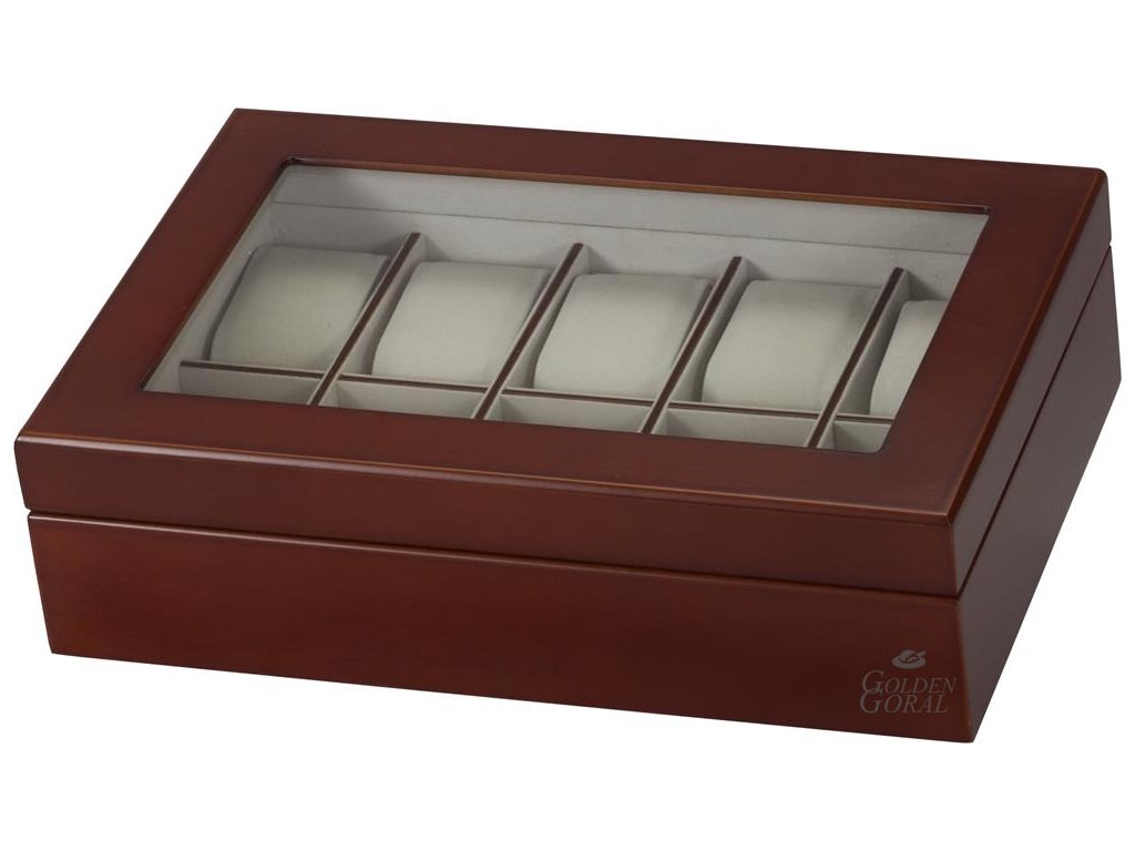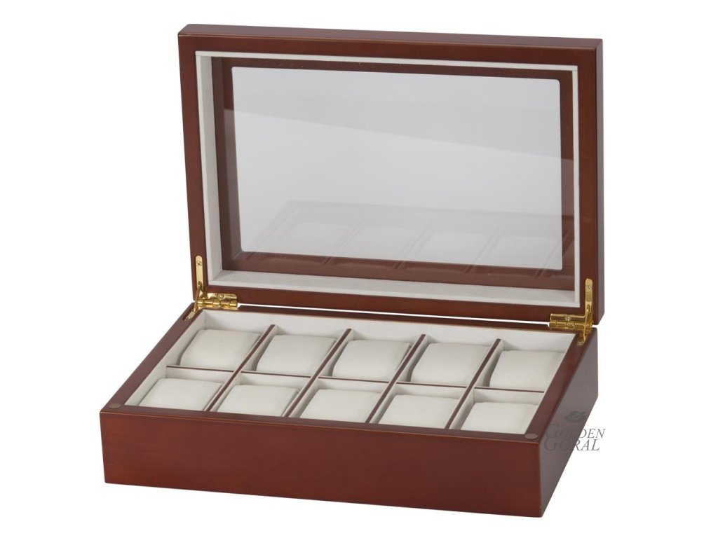 Drevený pánsky box hnedej farby je určený pre 10 ks hodiniek. Vnútro je čalúnené kvalitnou zamatovou látkou pre bezpečné uloženie.