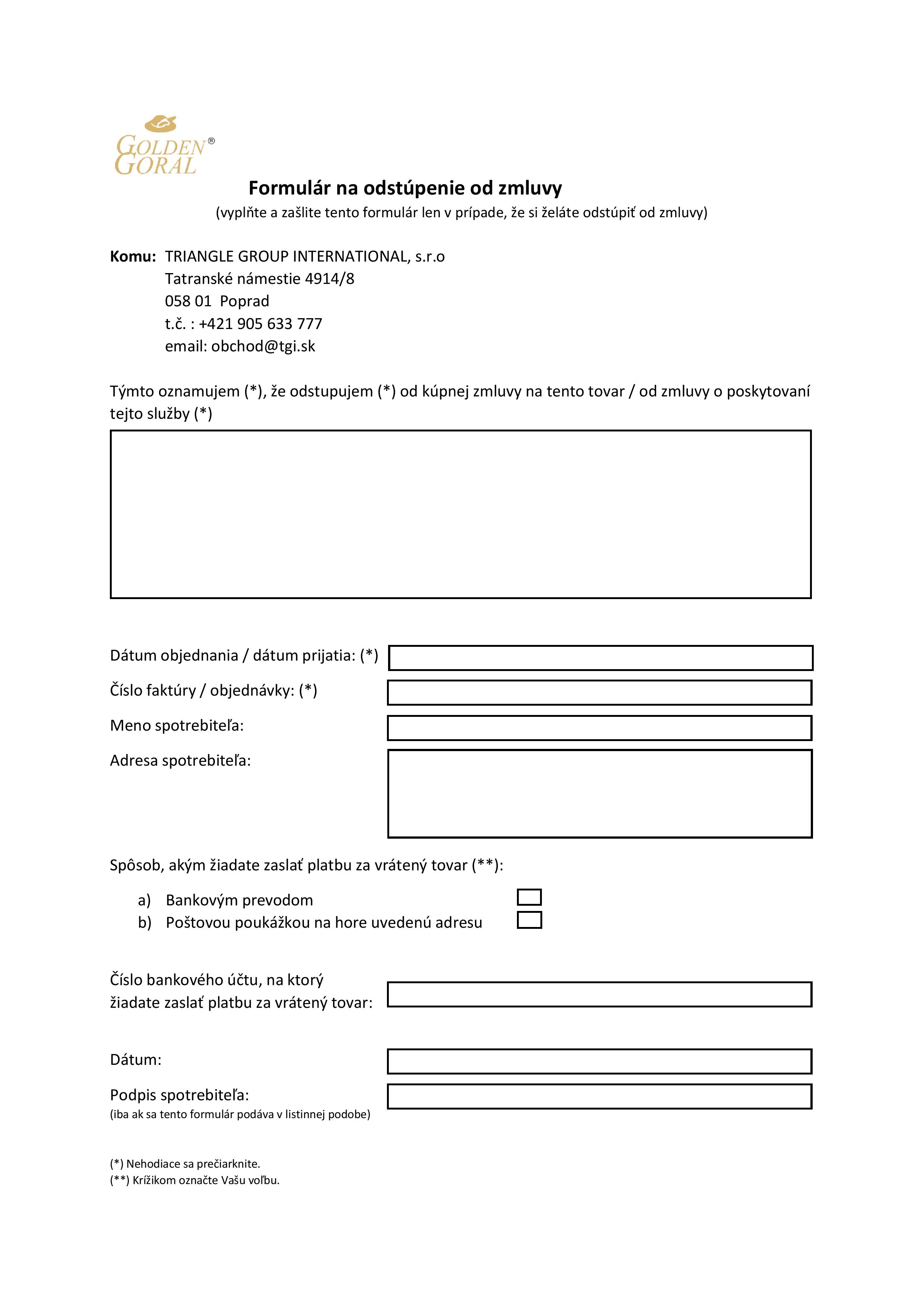 17. Reklamáciu uplatní kupujúci písomne odoslaním reklamačného formulára na adresu predávajúceho: TRIANGLE GROUP INTERNATIONAL, s.ro., Tatranské námestie 4914/8, Poprad 058 01, a zároveň zašle na adresu predávajúceho aj reklamovaný tovar vrátane jeho príslušenstva a dokladu o kúpe reklamovaného tovaru (faktúra alebo pokladničný doklad z registračnej pokladnice), ktorým preukáže, že reklamovaný tovar bol zakúpený u predávajúceho.